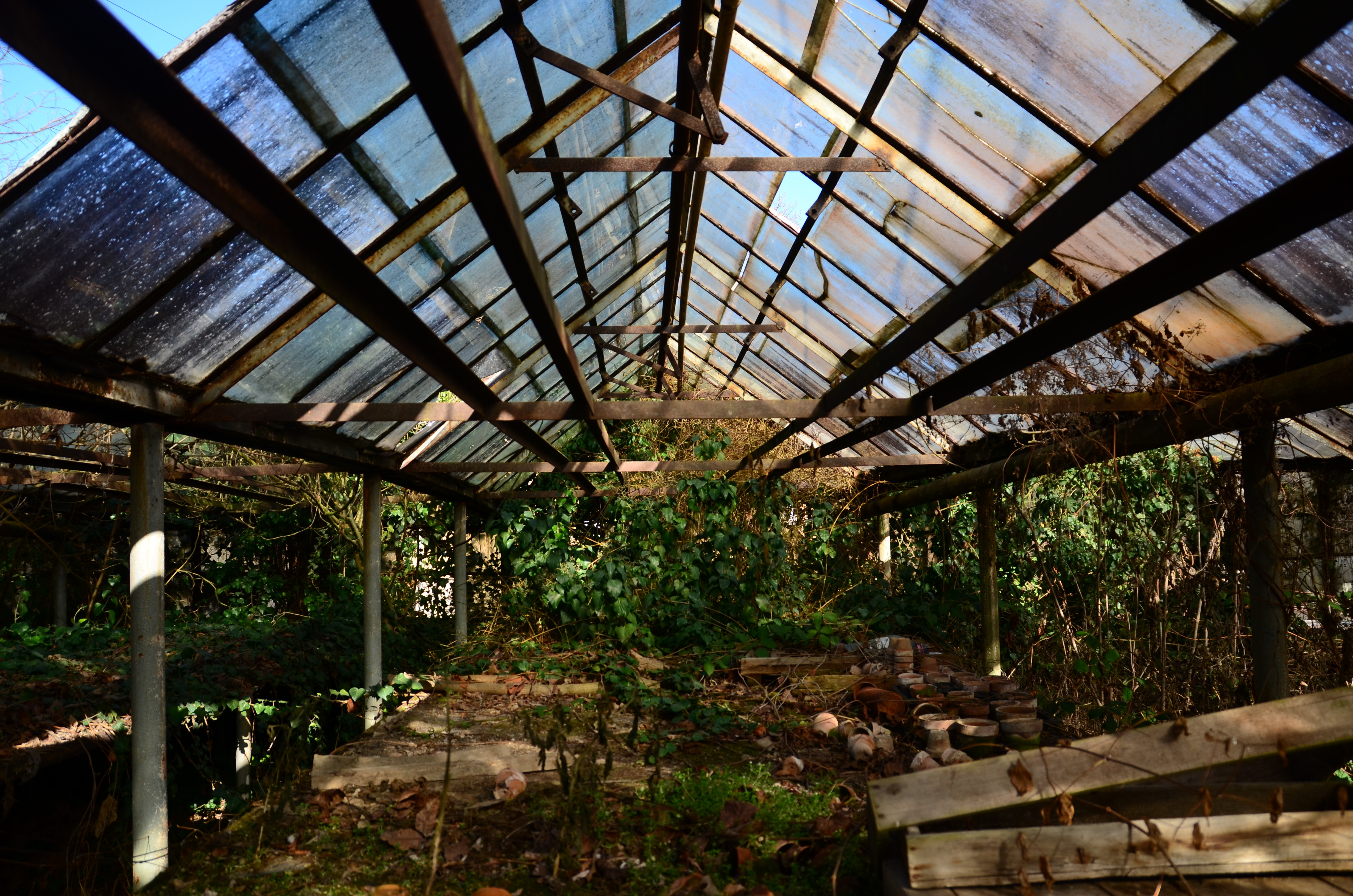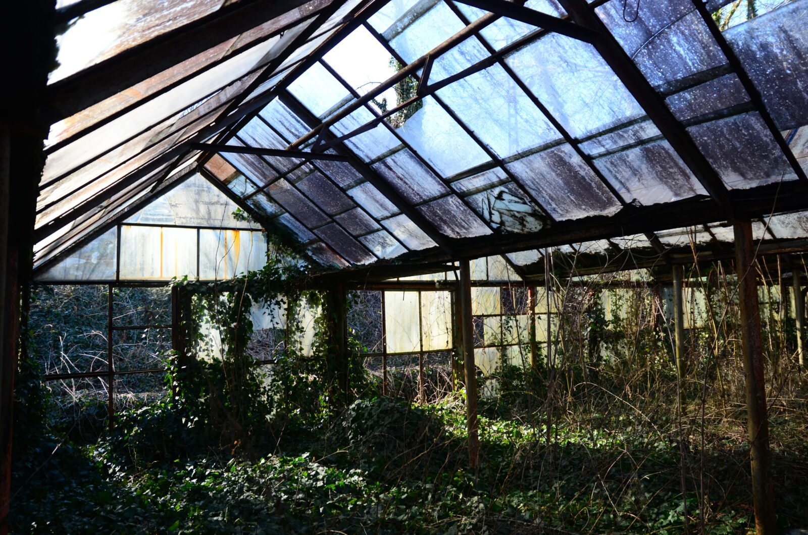 Today they are degraded, overgrown with vegetation, littered with piles of chipped pots, dried cacti and palm trees, and their glass roofs pierced by young trees. But still full of character and potential.